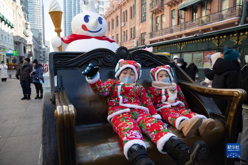 1月1日,小朋友在哈爾濱道里區中央大街游玩。