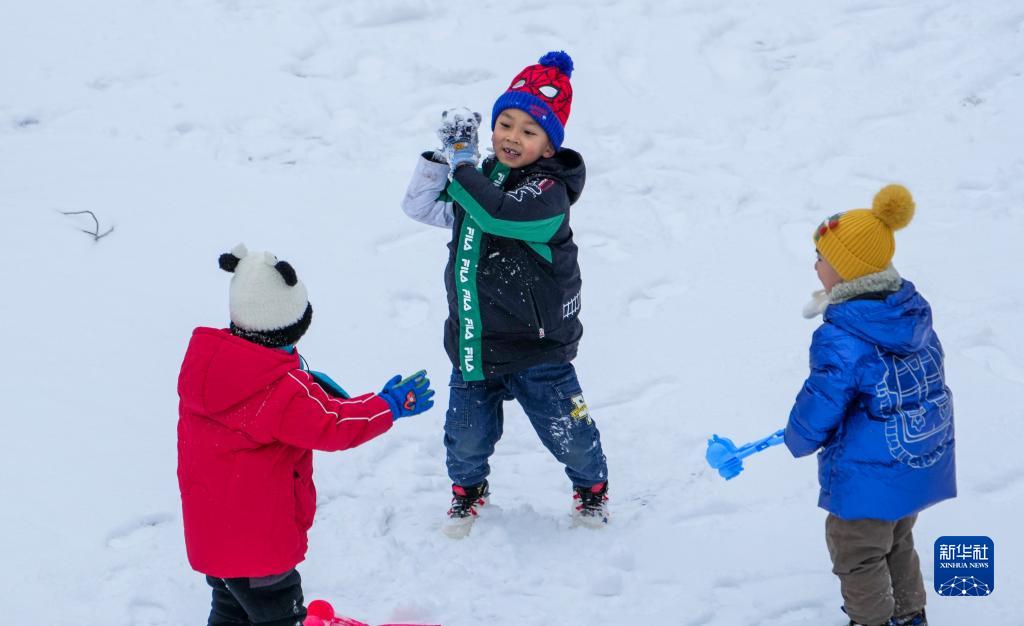 1月1日,三名小朋友在金佛山景區內玩雪。