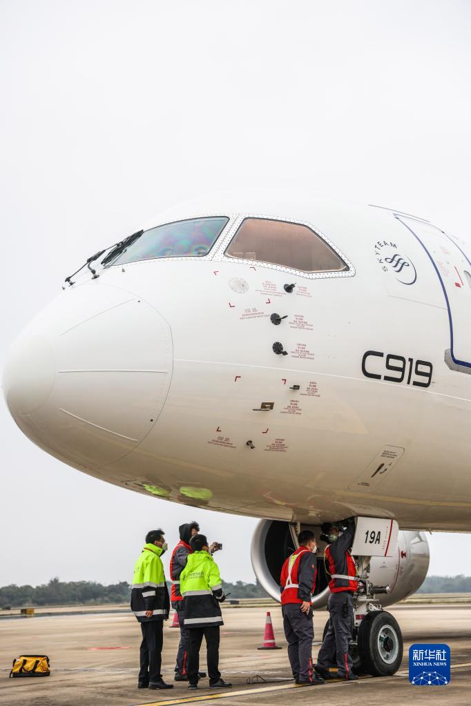 新華全媒+丨國產(chǎn)大飛機C919飛抵??诿捞m國際機場(chǎng)