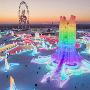 冬日夕陽(yáng)下,第24屆哈爾濱冰雪大世界園區流光溢彩,夢(mèng)幻壯觀(guān),來(lái)自天南海北的游客在園區內暢享冰情雪趣。