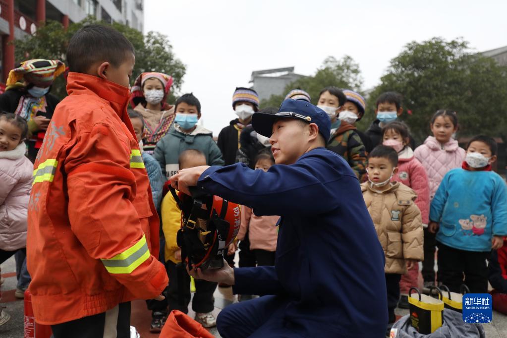 1月4日,在資興市唐洞街道茶坪瑤族村,小朋友在消防員的幫助下試穿搶險救援服。