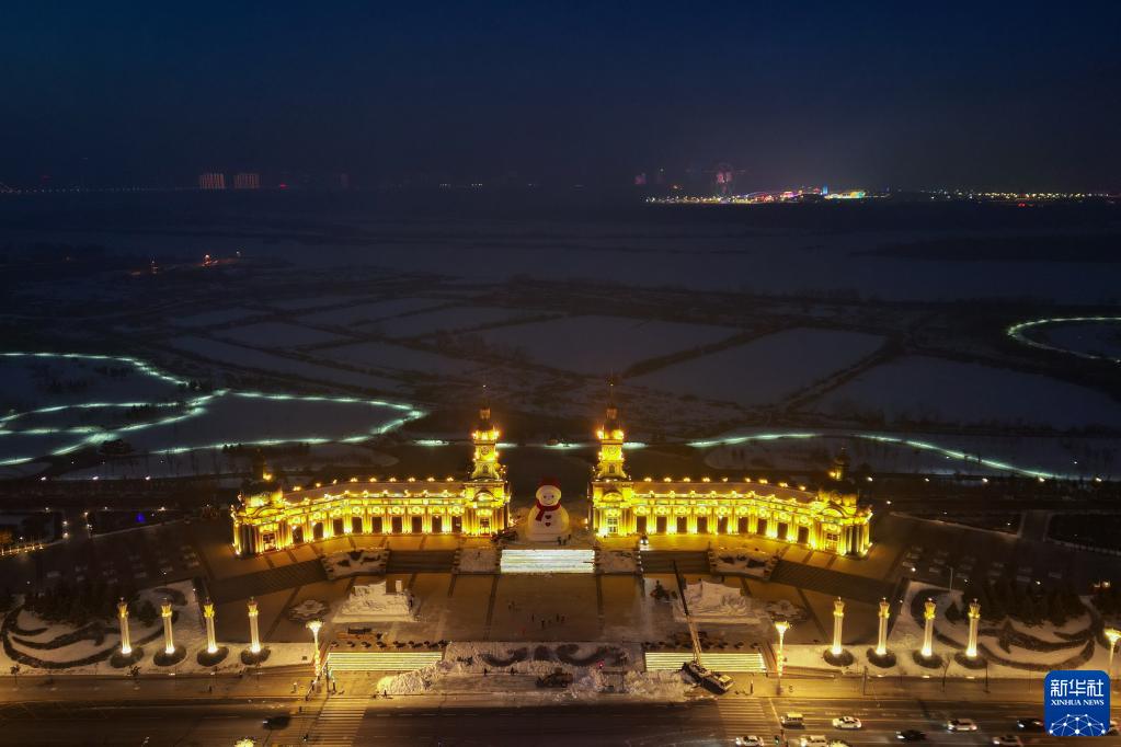 1月4日,在哈爾濱松花江畔,工人進(jìn)行大雪人收尾工作(無(wú)人機照片)。