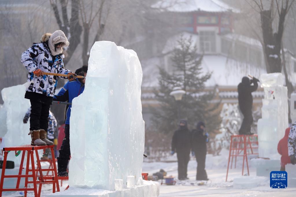 1月6日,在哈爾濱冰燈藝術(shù)游園會(huì )園區,冰雕師在進(jìn)行冰雕作品創(chuàng )作。