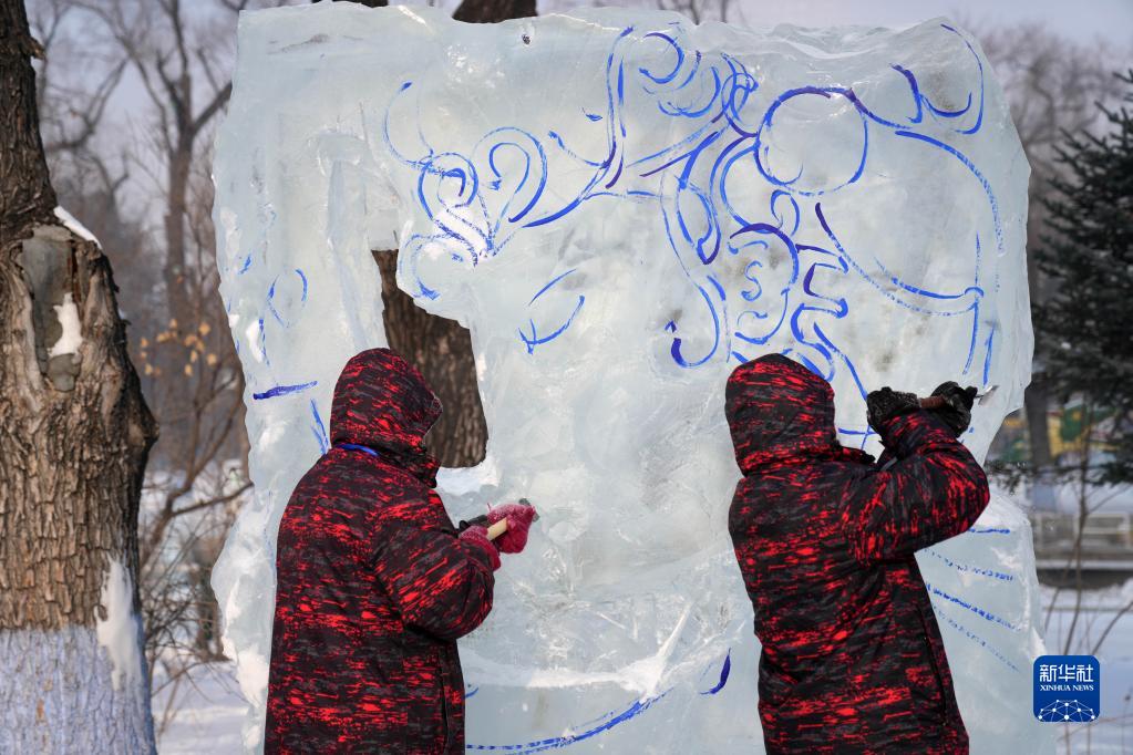 1月6日,在哈爾濱冰燈藝術(shù)游園會(huì )園區,冰雕師在進(jìn)行冰雕作品創(chuàng )作。