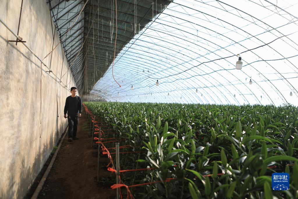 1月5日,在遼寧省凌源市小城子鎮楊大營(yíng)子村,花農胡永全在大棚內檢查百合長(cháng)勢。