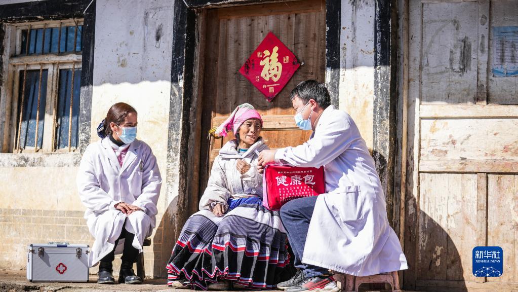 1月6日,醫務(wù)工作者到六盤(pán)水市鐘山區金盆苗族彝族鄉雙塘村村民家中巡診送藥。