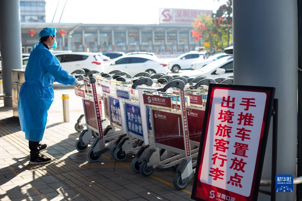 1月6日,在深圳灣口岸,工作人員在整理行李手推車(chē)。