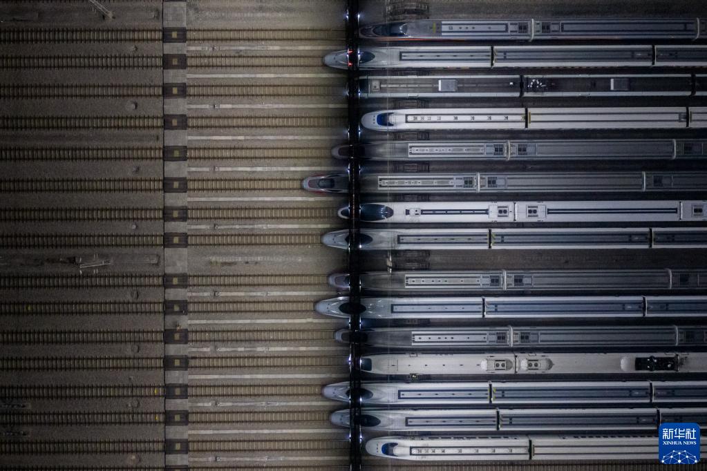 1月7日凌晨,動(dòng)車(chē)組列車(chē)??吭谖錆h動(dòng)車(chē)段的存車(chē)線(xiàn)上(無(wú)人機照片)。