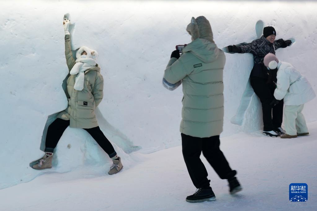 1月6日,游客在哈爾濱冰雪大世界園區的雪墻前拍照。