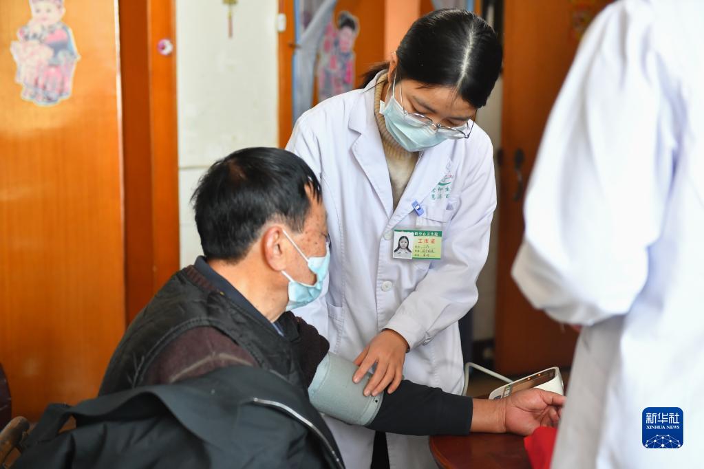 1月7日,醫護人員在湖南省湘潭市雨湖區姜畬鎮姜畬社區上門(mén)為老人測量血壓。