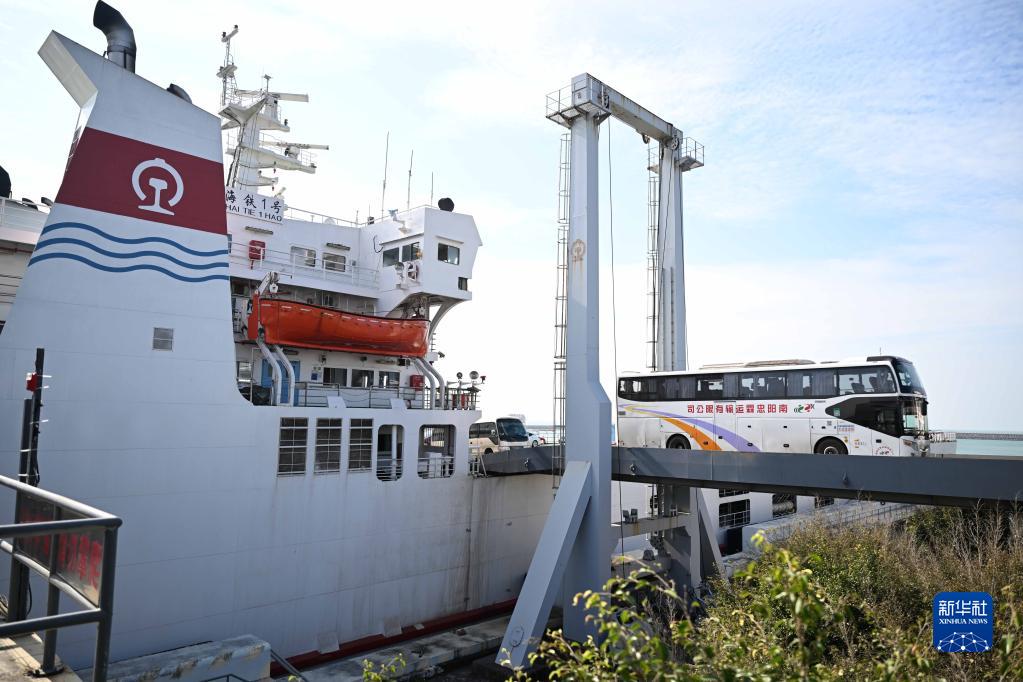 1月6日,在位于??诘幕浐hF路輪渡南港碼頭,車(chē)輛駛離粵海鐵1號輪渡。
