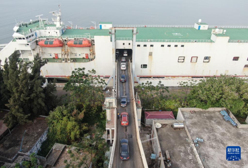 1月7日,在廣東徐聞的粵海鐵路輪渡北港碼頭,過(guò)海車(chē)輛駛入粵海鐵4號輪渡(無(wú)人機照片)。