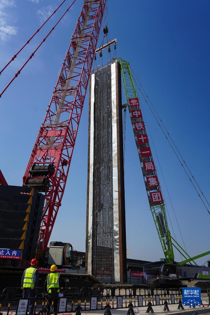 1月7日,在深江鐵路深莞隧道西段出口明挖隧道施工現場(chǎng),兩臺吊機配合著(zhù)將首幅地連墻鋼筋籠抬吊至垂直位置。