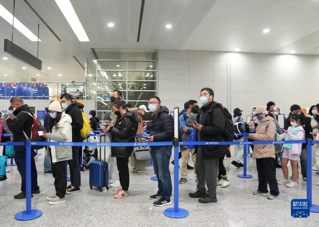 1月8日,在上海浦東國際機場(chǎng),旅客排隊等待辦理入境手續。