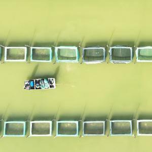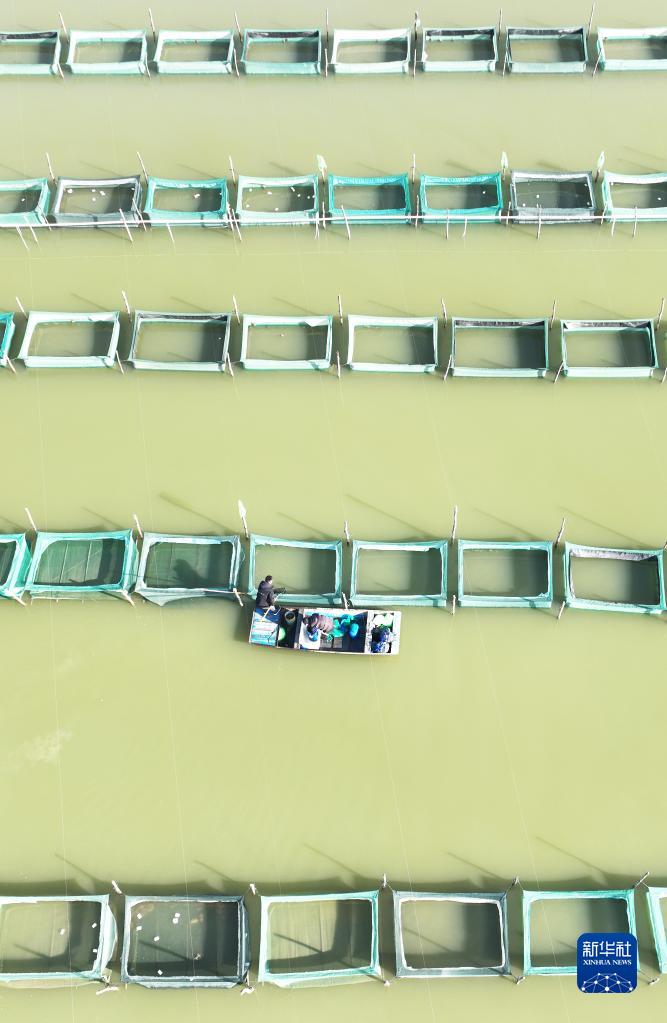 1月8日,在泗洪縣臨淮鎮螃蟹養殖基地,養殖戶(hù)在捕撈螃蟹(無(wú)人機照片)。