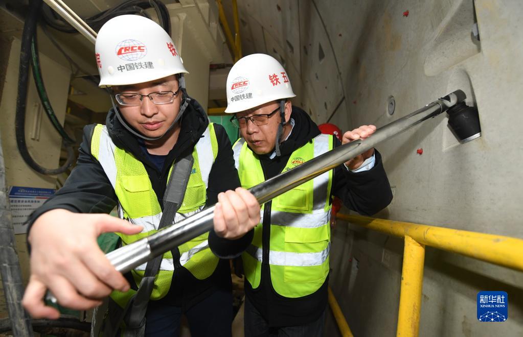 梅東冬(右)在雄安新區至北京大興國際機場(chǎng)快線(xiàn)(R1線(xiàn))一標段項目地下隧道巡查(1月18日攝)。