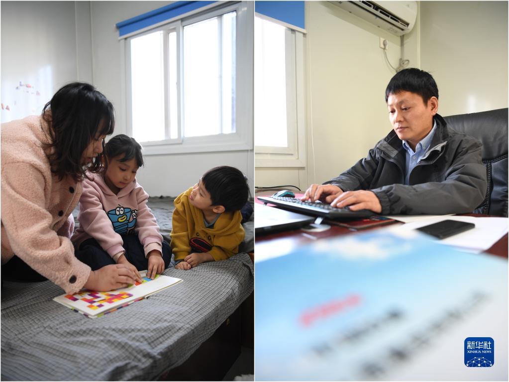 拼版照片:左圖為1月18日,郭麗娜(左一)帶著(zhù)女兒和兒子在項目部的宿舍里做游戲;右圖為1月18日,李輝在項目部辦公室內工作。