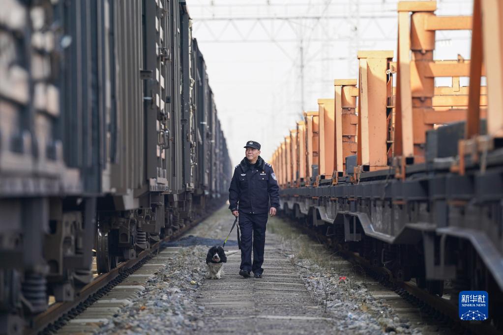 1月18日,民警王支斌和警犬“和平”在車(chē)站內巡邏。