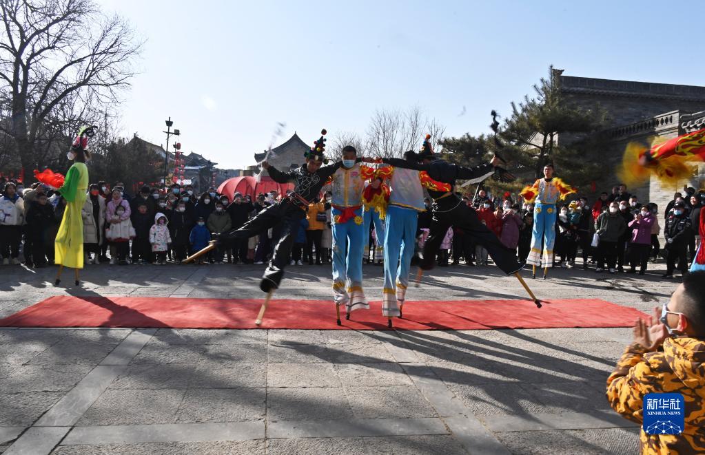 1月22日,游客在山西省陽(yáng)曲縣青龍古鎮內觀(guān)看踩高蹺表演。