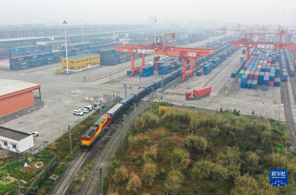 1月22日,兔年首趟西部陸海新通道鐵海聯(lián)運班列從重慶團結村中心站發(fā)車(chē)(無(wú)人機照片)。