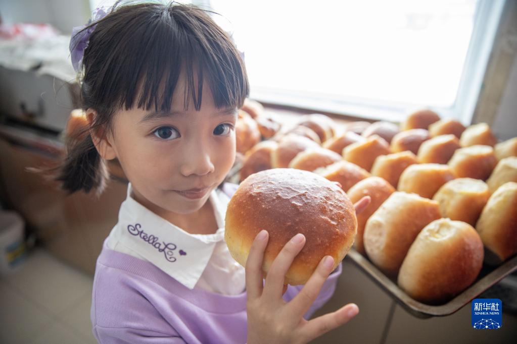 1月12日,一名小朋友在黑龍江省漠河市北紅村“最北面包房”內展示面包。