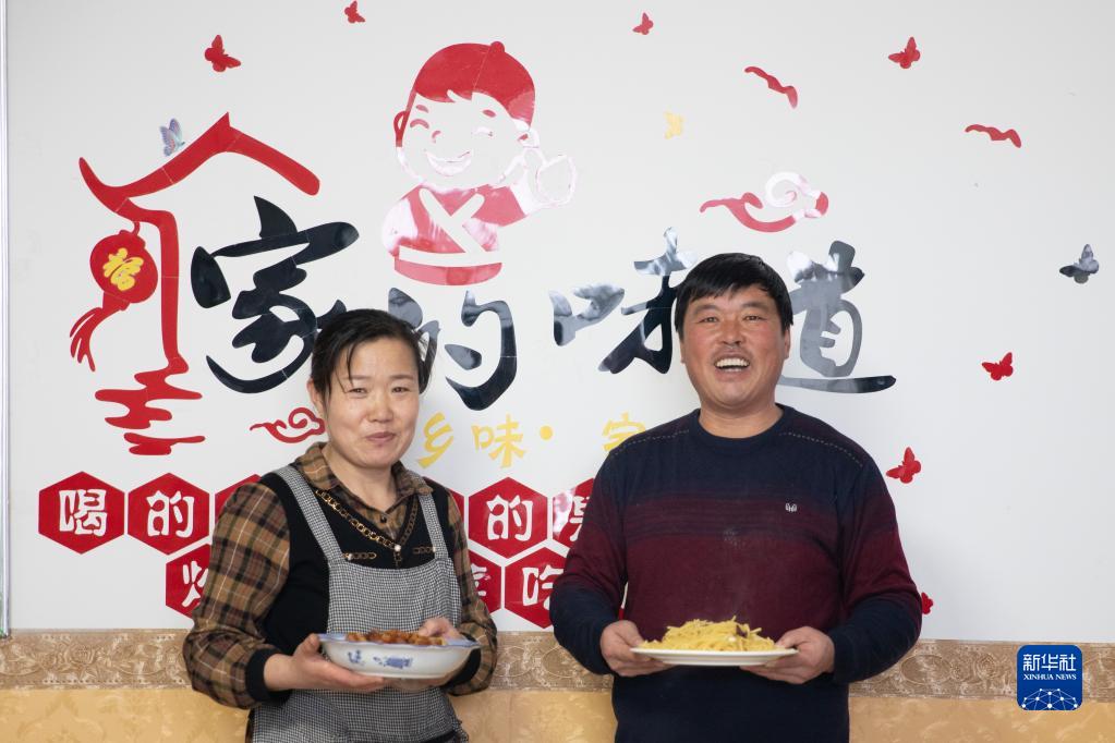 1月12日,在黑龍江省漠河市北紅村農家樂(lè ),任金紅(右)和妻子準備給游客上菜。