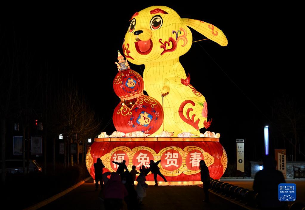 人們在寧夏吳忠市鹽池縣九曲民俗文化園觀(guān)賞兔子造型花燈(1月22日攝)。