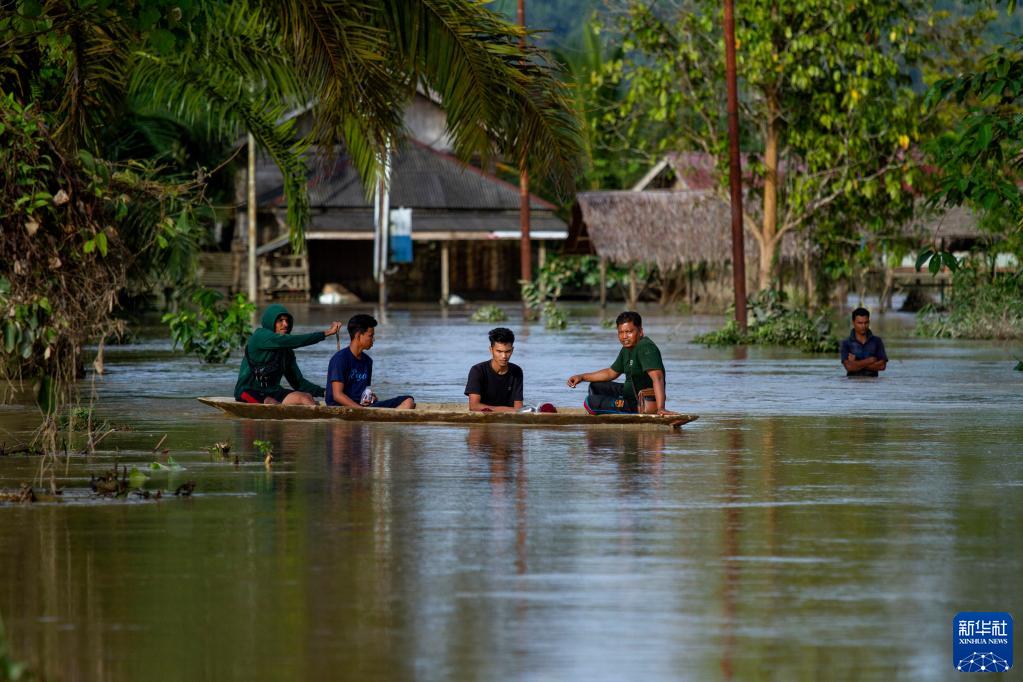 1月23日,在印度尼西亞亞齊特區北亞齊地區,人們在洪水中乘獨木舟。