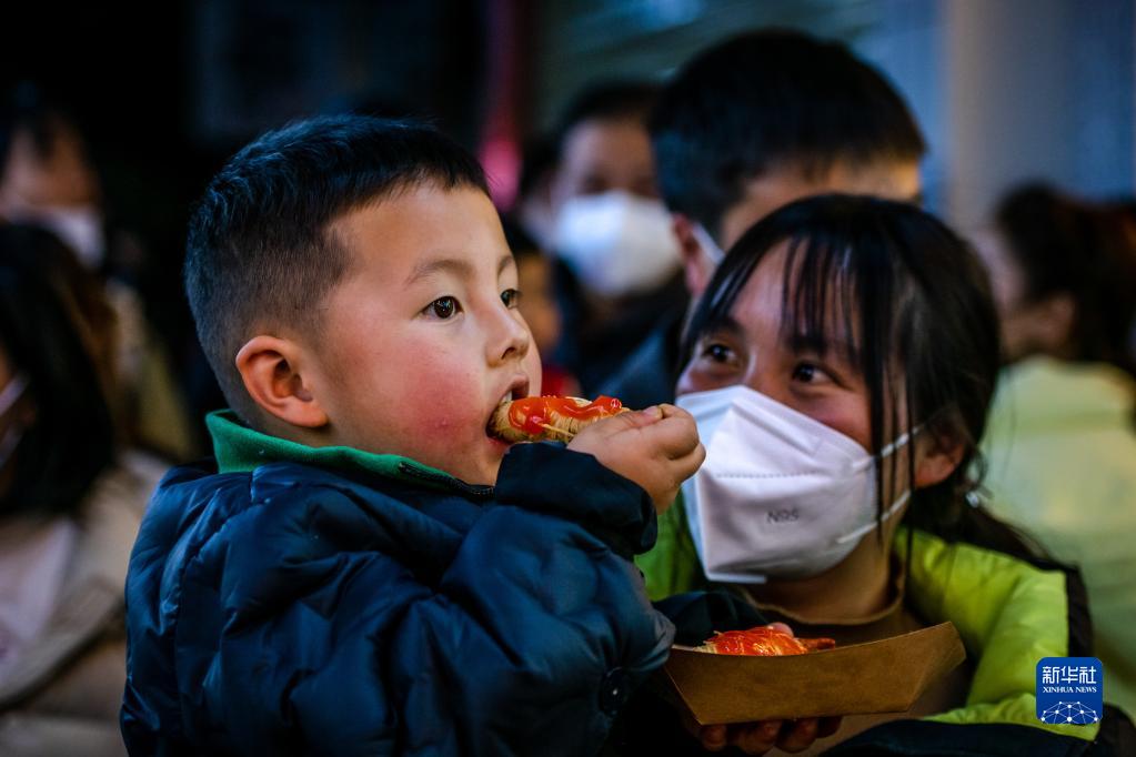 1月23日,在云南省昆明市南屏街,一個(gè)小孩子在品嘗特色小吃。
