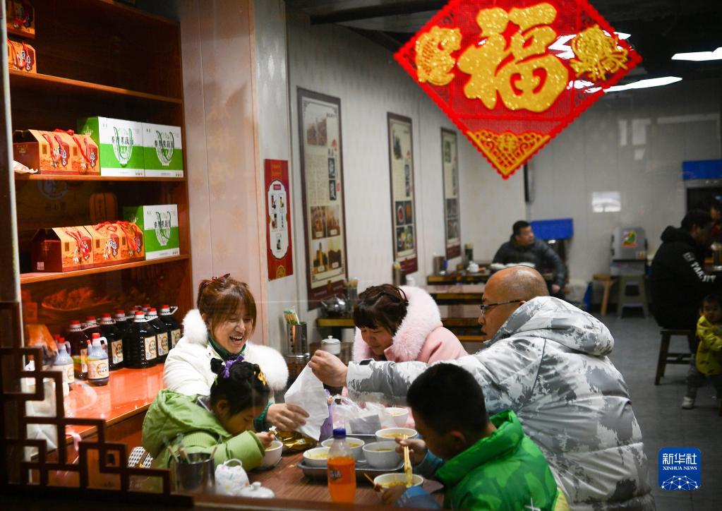 1月24日,在位于陜西省咸陽(yáng)市的福園巷子街區,游客在一家商鋪品嘗臊子面。