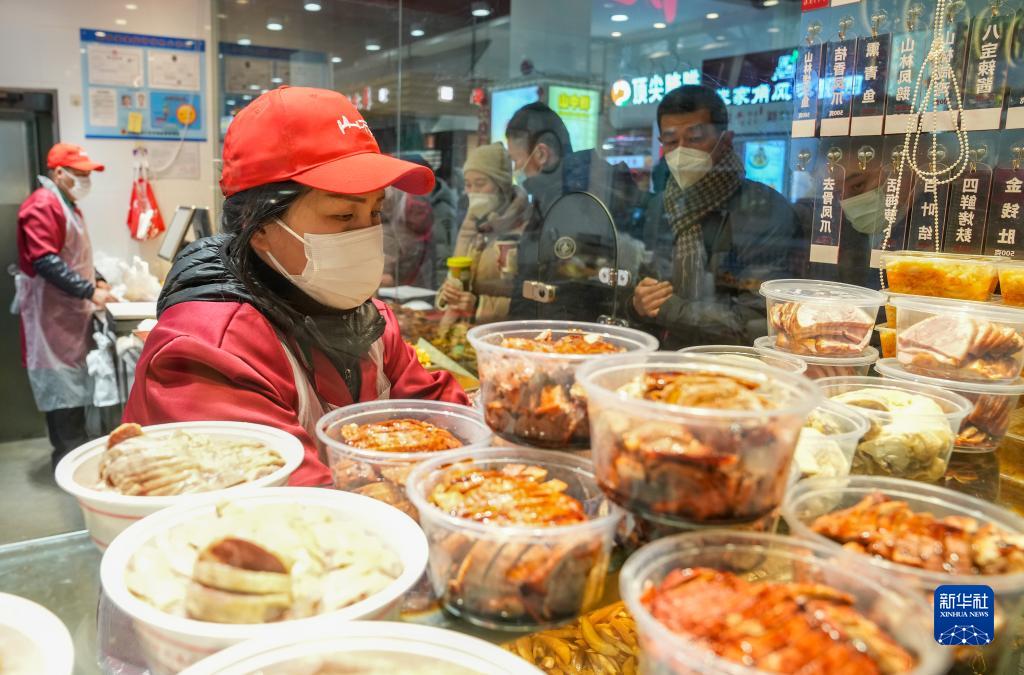 1月24日,在上海徐家匯商圈的一家商店內,店員在為顧客準備美食。
