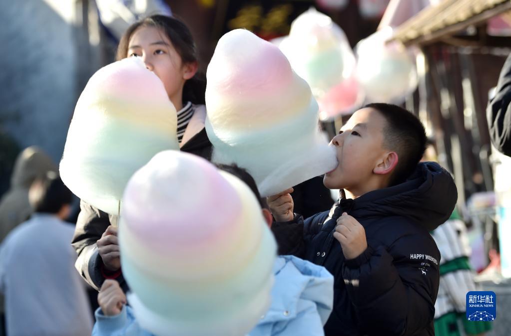 1月24日,在河北省石家莊市鹿泉區土門(mén)關(guān)驛道小鎮,小朋友品嘗棉花糖。