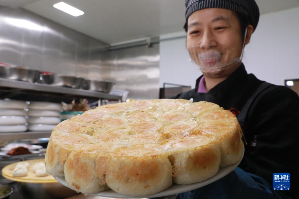 1月24日,在山東省高密市一家酒店內,廚師展示剛剛出鍋的當地傳統美食“高密爐包”。