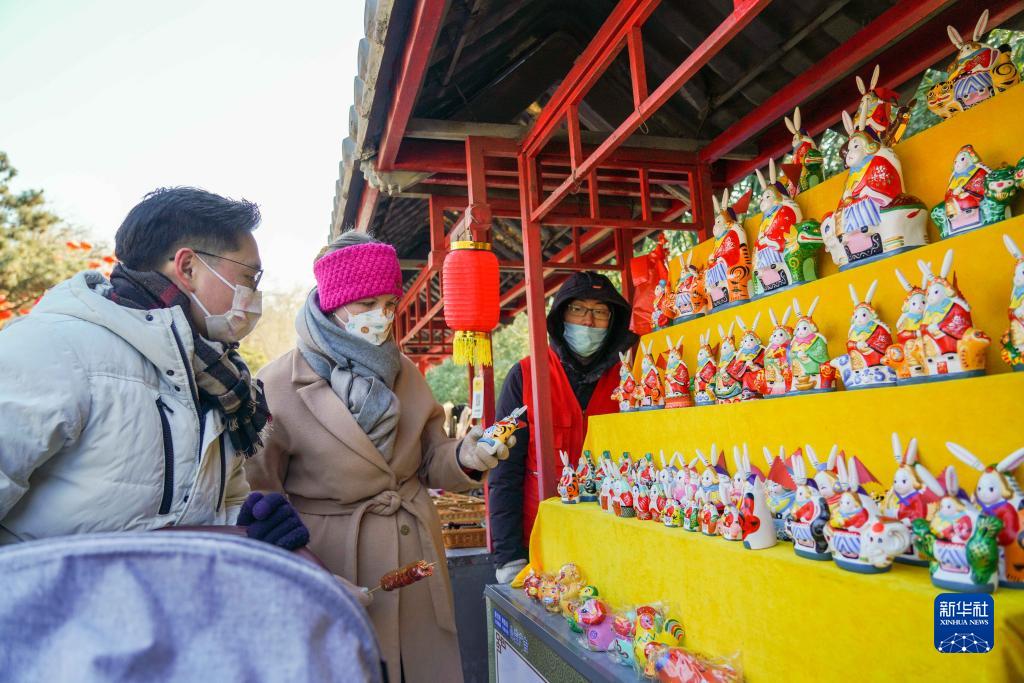 1月24日,張珍妮和丈夫在北京八大處公園舉辦的第十屆八大處新春文化廟會(huì )上游玩時(shí),家人給張珍妮講述兔兒爺的故事。