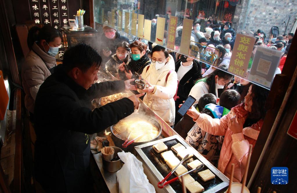 1月24日,顧客在南京老門(mén)東的小吃攤位購買(mǎi)特色美食。