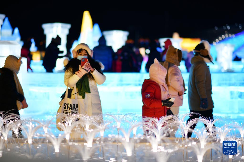 1月24日,游客在哈爾濱冰雪大世界園區內游玩、拍照。