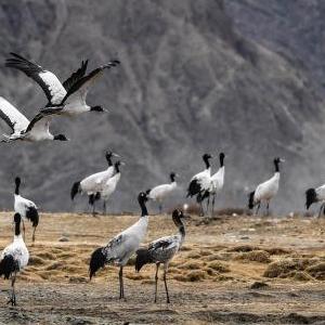 在西藏雅魯藏布江中游河谷黑頸鶴國家級自然保護區日喀則片區拉孜縣附近,大量越冬的黑頸鶴翩翩起舞,迎接春天的到來(lái)。