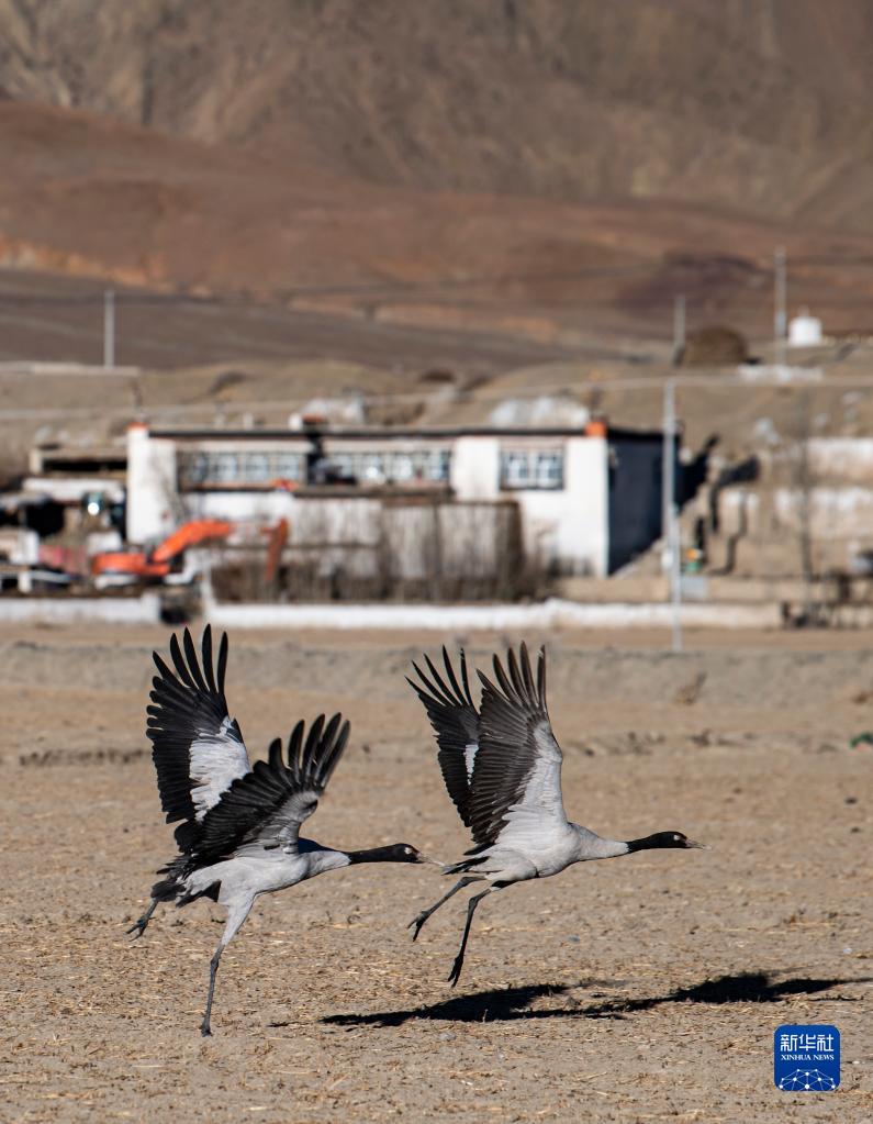 在西藏雅魯藏布江中游河谷黑頸鶴國家級自然保護區日喀則片區拉孜縣附近,大量越冬的黑頸鶴翩翩起舞,迎接春天的到來(lái)。