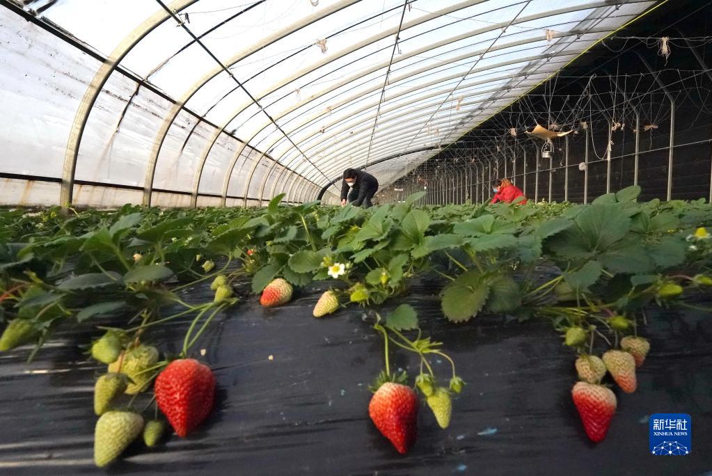1月25日,河北省灤州市茨榆坨鎮的農民在大棚里采摘草莓。