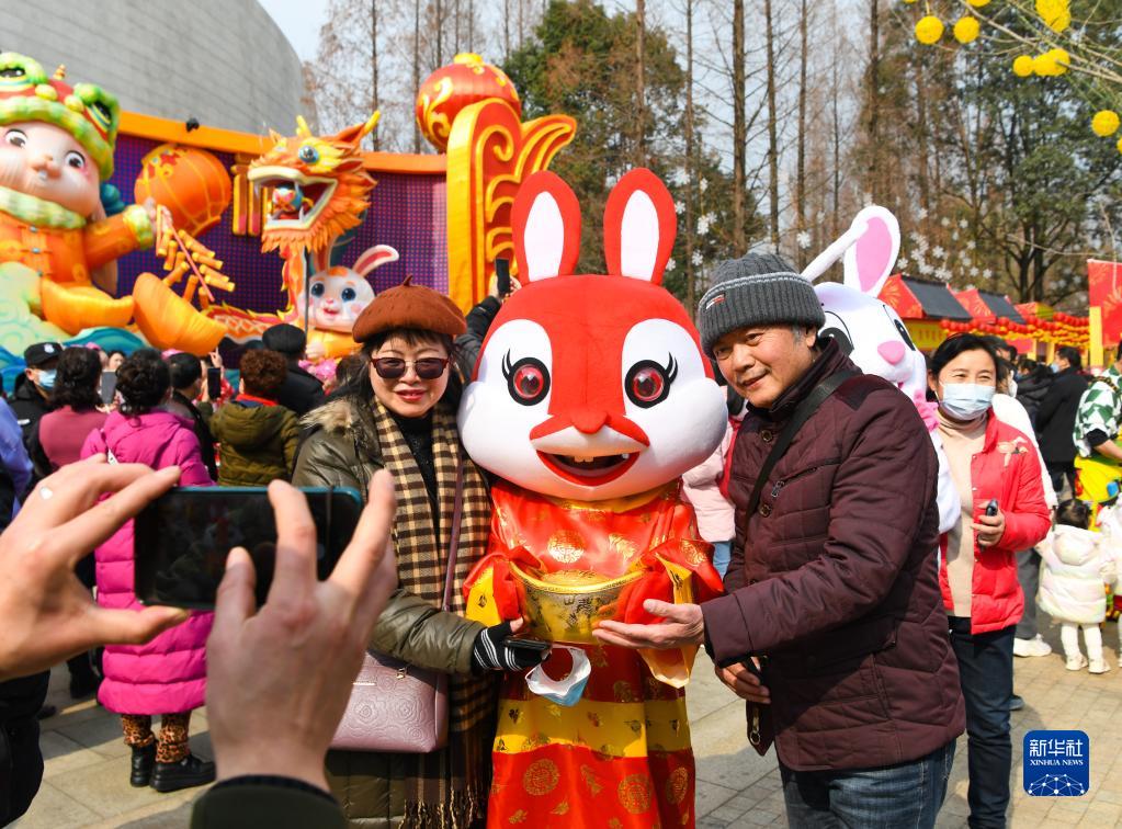 1月25日,在四川成都2023金沙太陽(yáng)節活動(dòng)現場(chǎng),游客和“招財兔”合影。