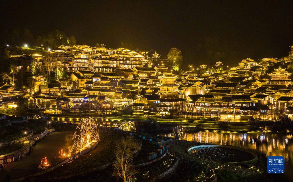 1月24日拍攝的貴州省遵義市烏江寨景區的打鐵花表演(無(wú)人機照片)。