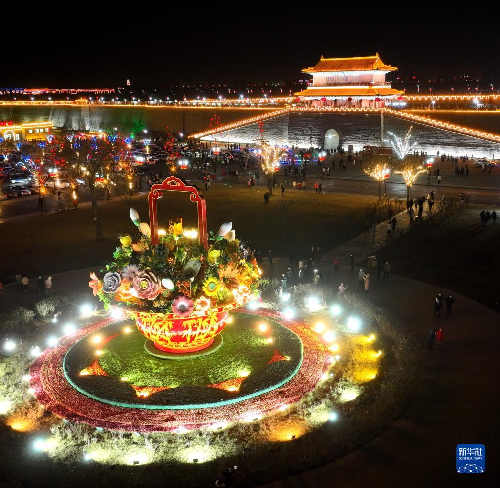 1月24日晚,市民在石家莊市正定古城游玩(無(wú)人機照片)。
