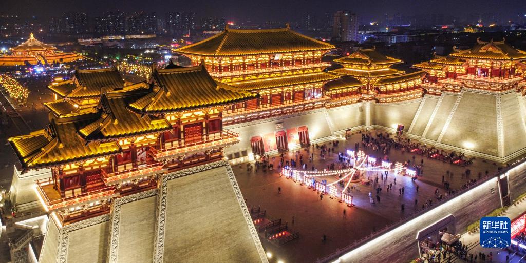 1月25日晚,游客在河南省洛陽(yáng)市隋唐洛陽(yáng)城國家遺址公園應天門(mén)遺址博物館游玩(無(wú)人機照片)。