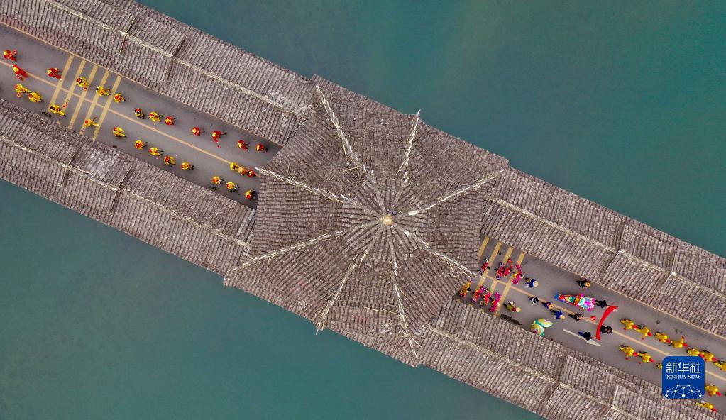 1月26日,民間藝人在貴州省銅仁市玉屏侗族自治縣風(fēng)雨橋上進(jìn)行民俗展演(無(wú)人機照片)。