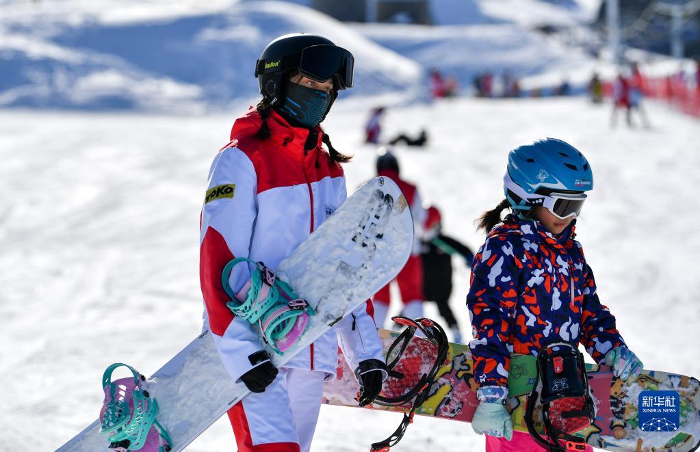 新疆絲綢之路國際度假區滑雪教練阿麗米熱·艾海提(左)帶著(zhù)小學(xué)員走進(jìn)兒童滑雪教學(xué)區(1月25日攝)。