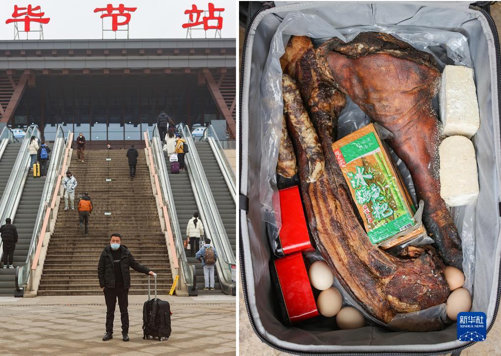 拼版照片:左圖為貴州省畢節市七星關(guān)區海子街鎮安山村人彭沙提著(zhù)行李在畢節站站前廣場(chǎng)留影,他準備前往廣東省深圳市(1月26日攝)。彭沙之前在深圳打工6年,此次是去學(xué)習汽車(chē)檢測管理技術(shù)。以前從畢節乘汽車(chē)到貴陽(yáng)轉乘綠皮火車(chē)再到深圳要兩天一夜,現在乘高鐵只要幾個(gè)小時(shí)就能到達。右圖為彭沙行囊里裝的物品(1月26日攝)。彭沙行囊里裝著(zhù)父母親手制作的臘肉、臘豬腳、香腸、茶葉、石灰豆腐、咸蛋及當地特色小吃冰糖黃粑等。