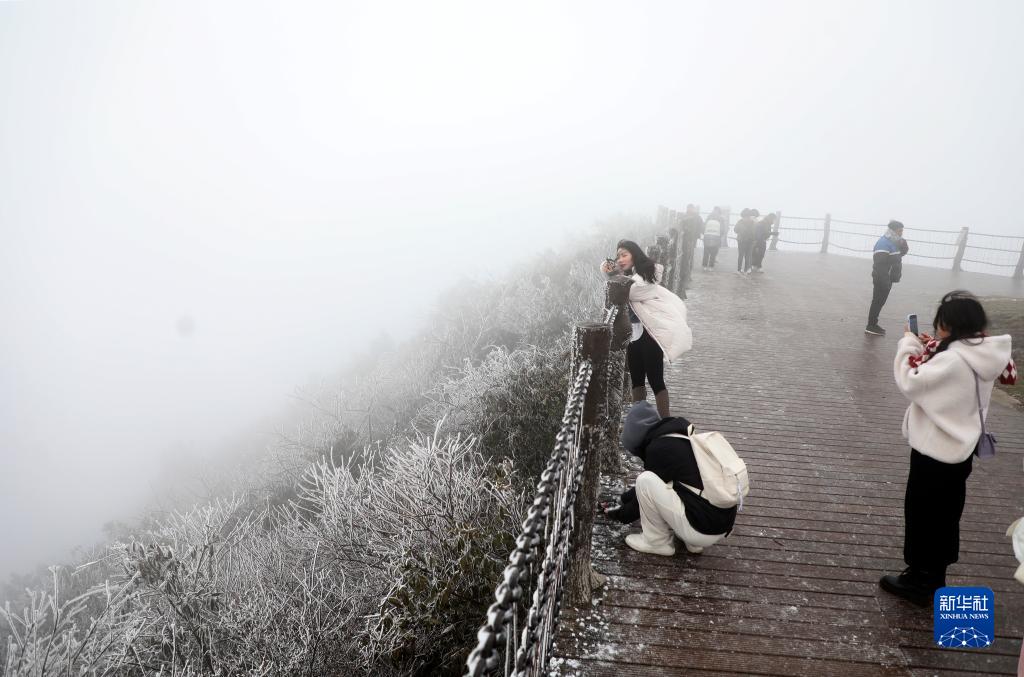 當日,湖南省資興市回龍山景區現霧凇現象,山中樹(shù)木銀裝素裹,吸引游人紛至沓來(lái)。