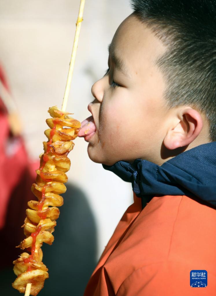 1月27日,小朋友在北京南鑼鼓巷品嘗小吃。