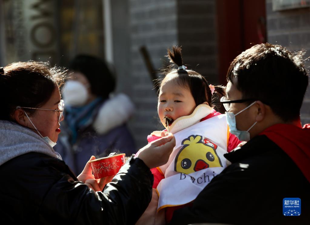 1月27日,游客在北京南鑼鼓巷品嘗特色小吃。