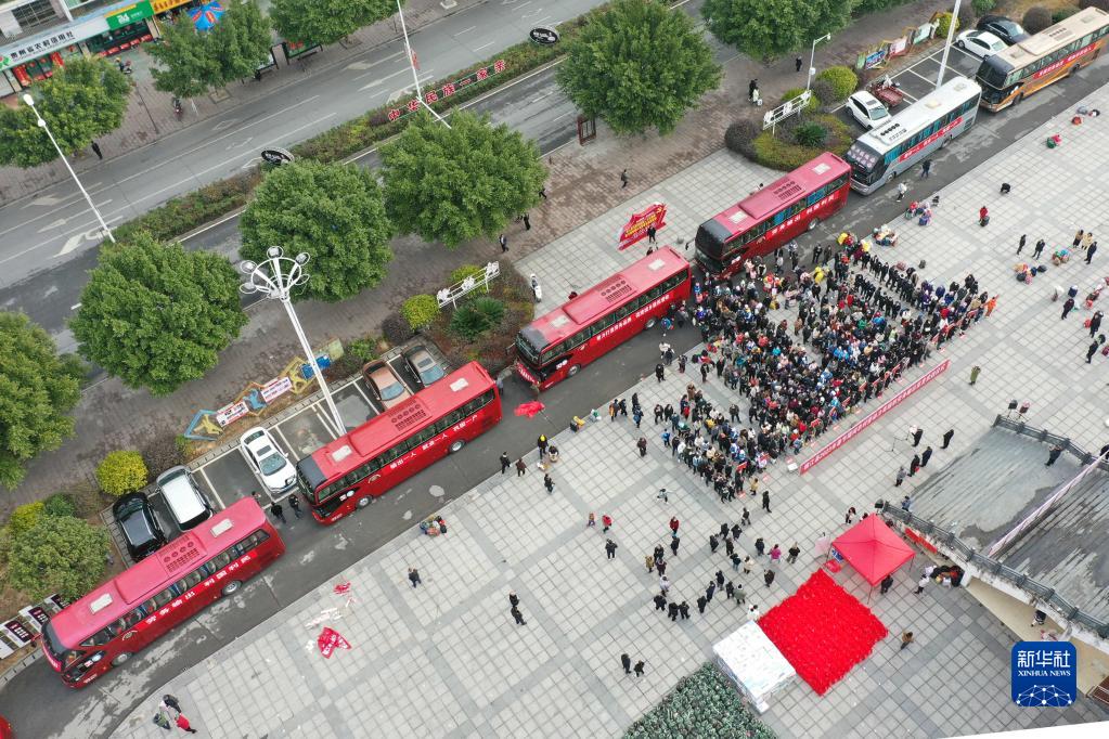 1月27日,黔東南苗族侗族自治州榕江縣舉行勞務(wù)輸出首發(fā)儀式(無(wú)人機照片)。